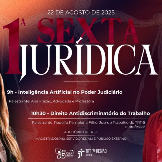 No próximo dia 22 de agosto de 2025, acontece a 1ª Sexta Jurídica, promovida pela Escola Judicial do TRT da 7ª Região (EJUD7), com foco em debates contemporâneos no campo do Direito e da Justiça do Trabalho.