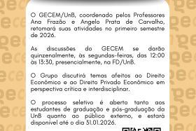 As reuniões acontecerão quinzenalmente, nas segundas-feiras, das 12:00 às 13:30, presencialmente na Faculdade de Direito da Universidade de Brasília.