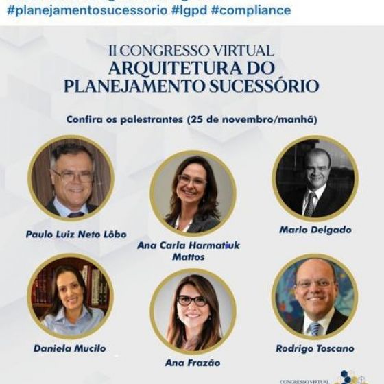 Ana Frazão participa do II Congresso Virtual Arquitetura do Planejamento Sucessório, em palestra sobre “LGPD, compliance e planejamento sucessório”, com transmissão ao vivo pela plataforma Zoom.